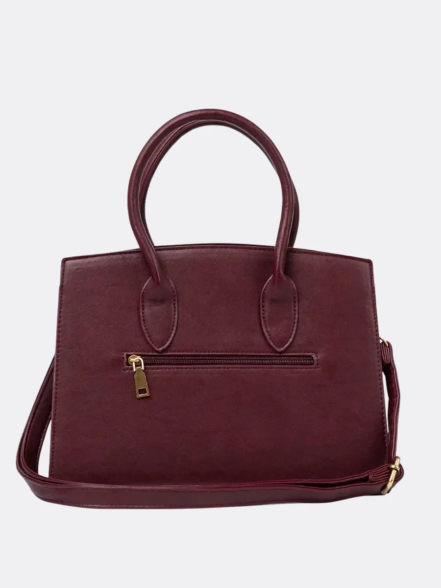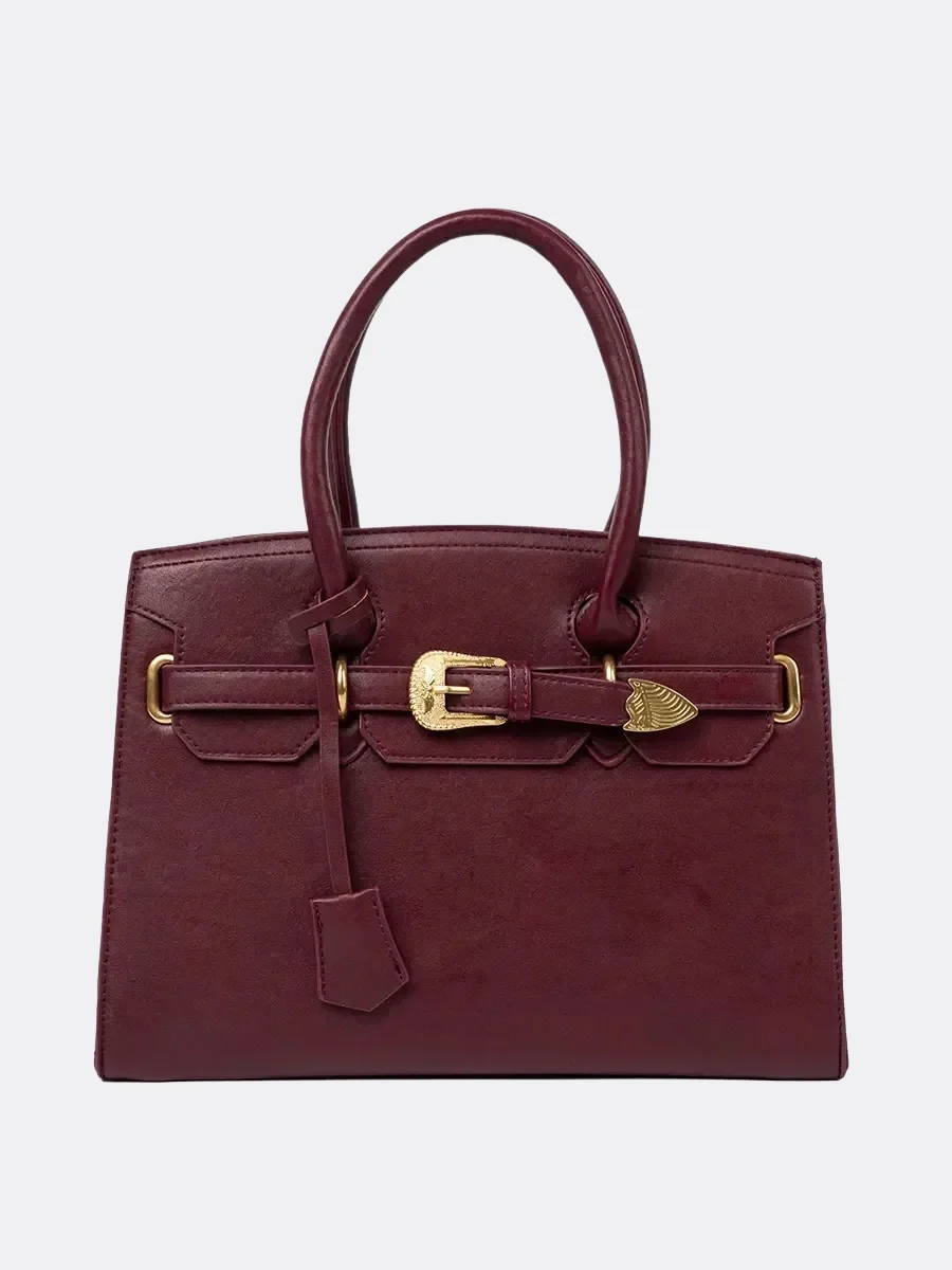 Make a bold statement with the Styvela Burgundy Gold Buckle Handbag, where timeless structure meets rich, modern color. Crafted from organic leather, this medium-sized handbag features a deep burgundy finish complemented by elegant gold-tone fittings and a signature decorative buckle — perfect for adding warmth and sophistication to any outfit.