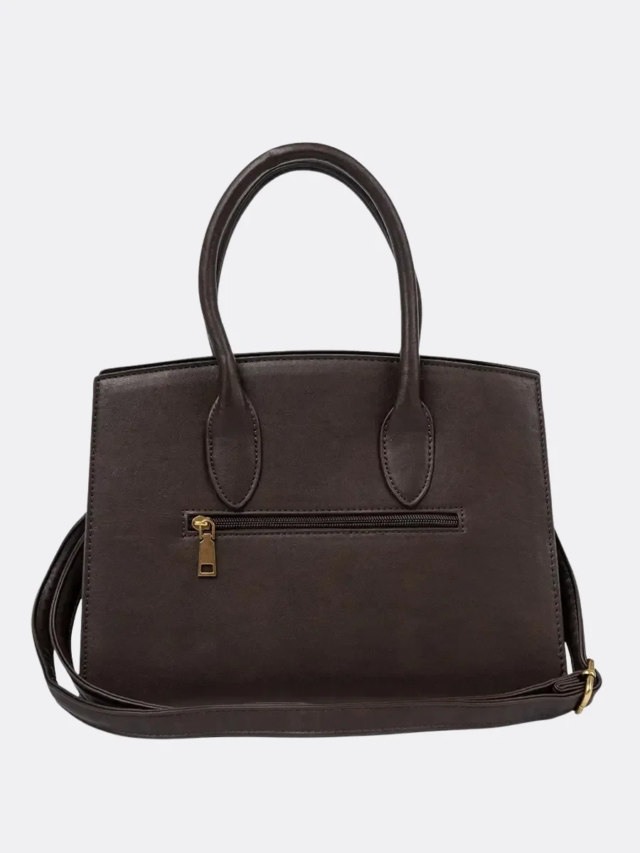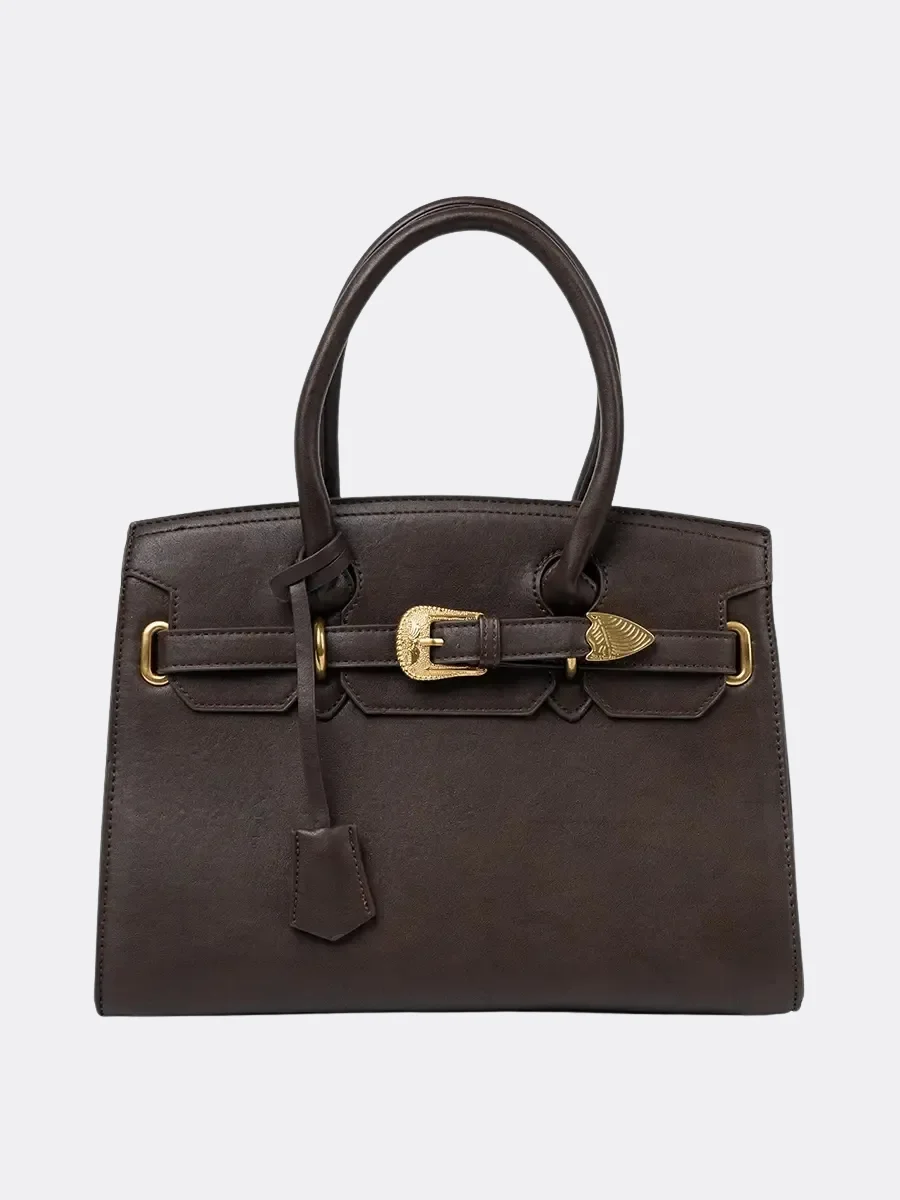 the Styvela Dark Brown Gold Buckle Handbag is a refined statement piece crafted from organic leather. Its deep, rich dark brown finish is beautifully contrasted by elegant gold-tone fittings and a striking decorative buckle, making it the ideal accessory for those who appreciate classic style with a modern edge.